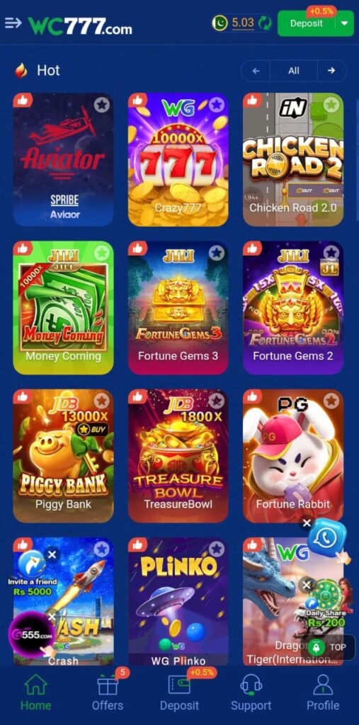Wc777 Game is one of the most popular and trending casino gaming application in Pakistan. This application offers the most amazing and trending casino games. Furthermore this platform offers an user friendly interface. This application offers more than 15 new games which will never let you get bored. Furthermore this platform gives bonuses and rewards just like Y444 Game. This platform offers bonuses like login bonus, daily bonus, referral bonus and this application also gives first deposit bonuses.